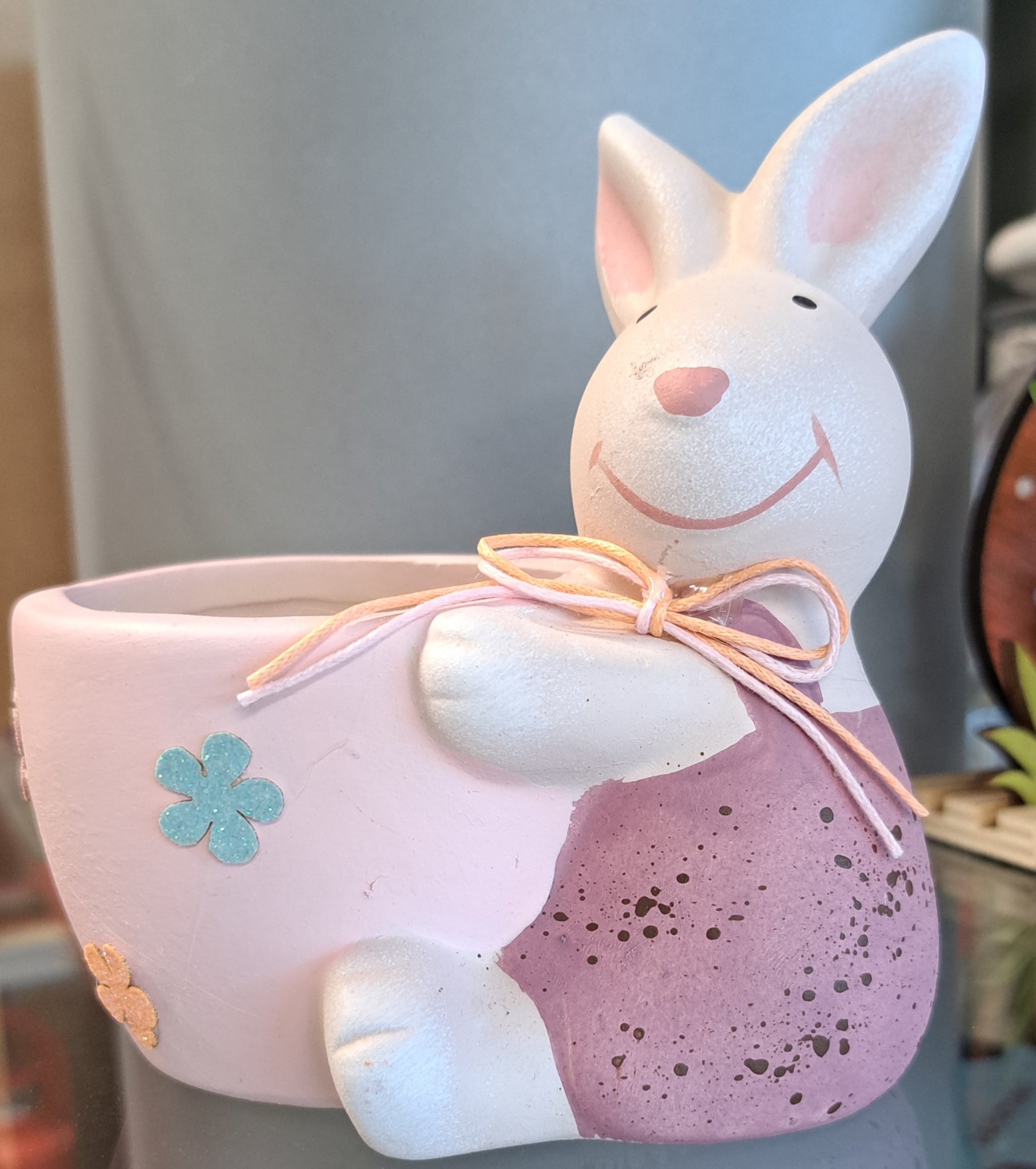 Simpatico coniglietto rosa con porta vaso, diam. cm.6 , altezza coniglio cm. 13