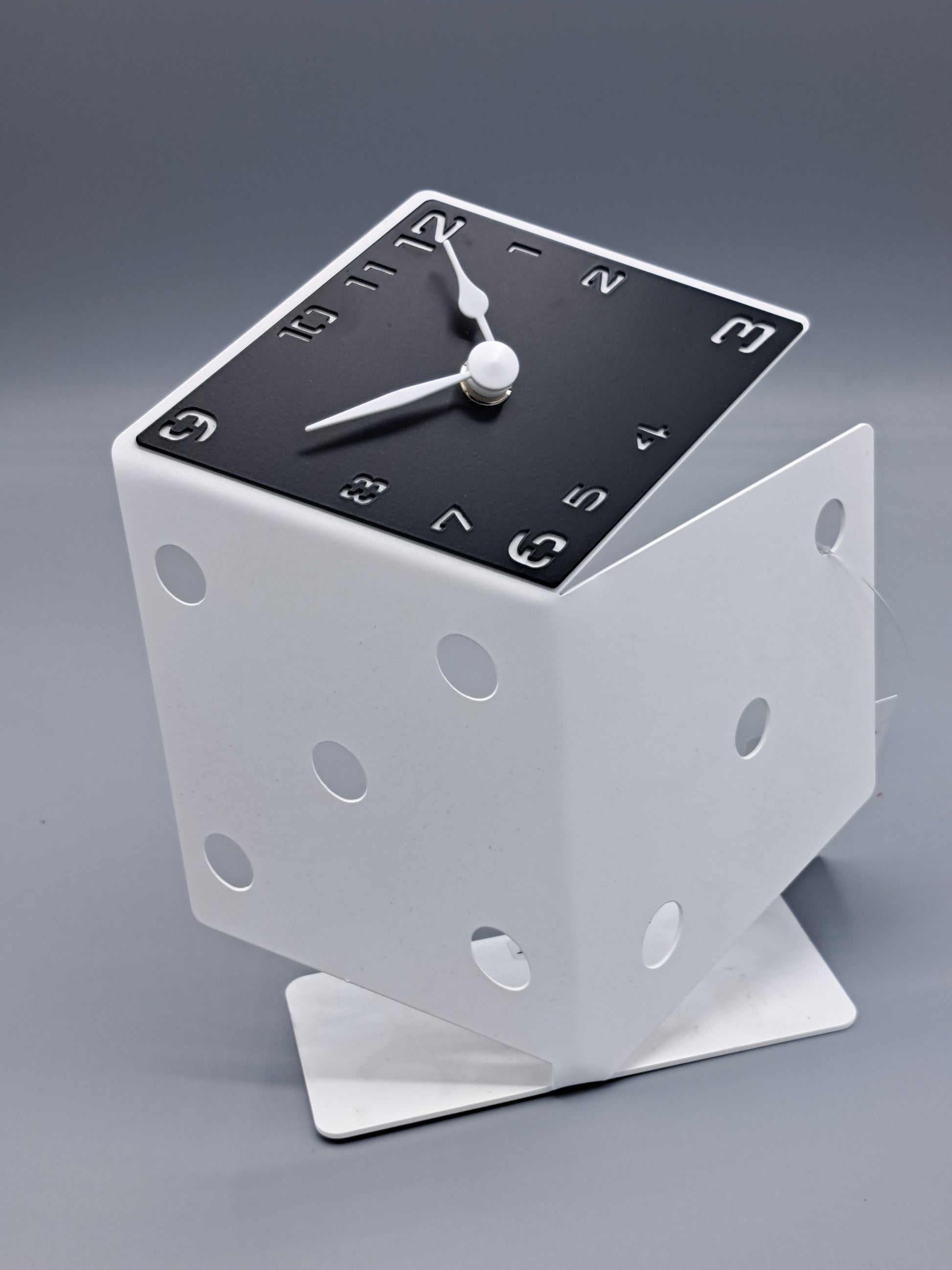 Orologio da tavolo, funzionamento a batteria AA, altezza cm. 18, lato quadrato cm. 9.